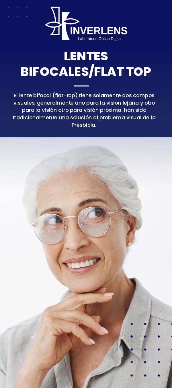 El lente bifocal (flat-top) tiene solamente dos campos visuales, generalmente uno para la visión lejana y otro para la visión otro para visión próxima, han sido tradicionalmente una solución al problema visual de la Presbicia.