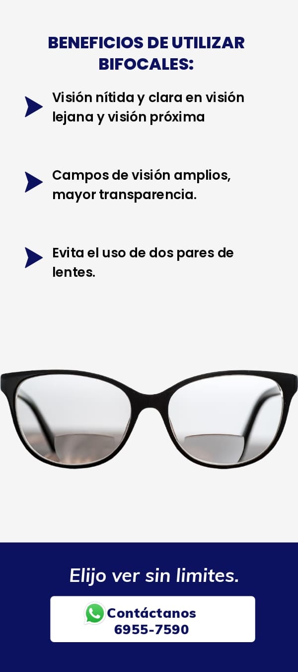 La parte superior de la lente está diseñada para la visión de lejos y el segmento circular en la parte inferior para la visión de cerca, ofreciendo dos amplios campos de visión.