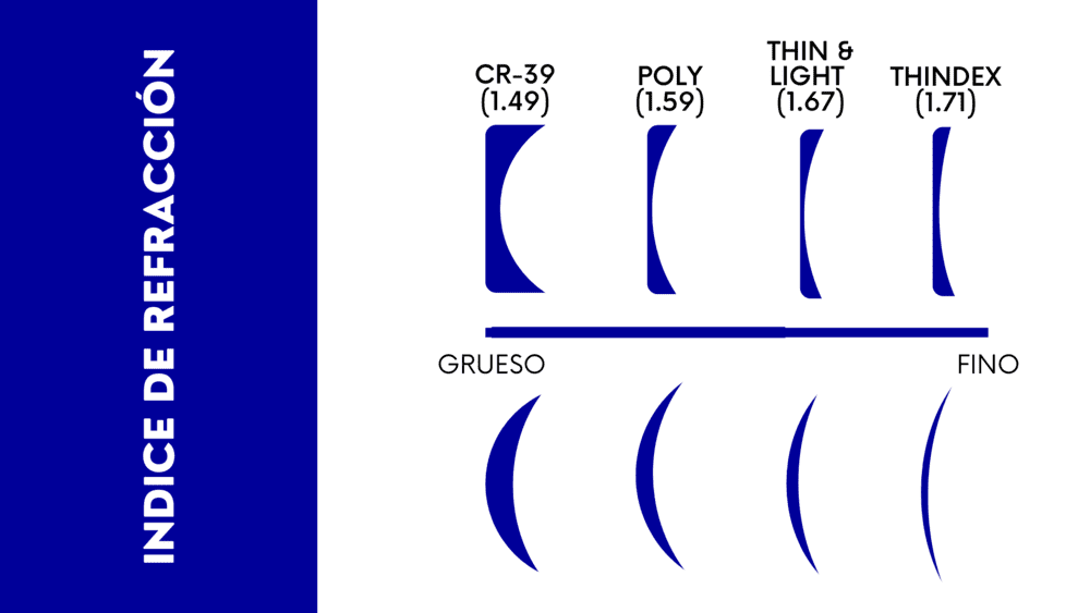 El índice de refracción es lo que determina la capacidad de la lente de los anteojos para desviar la luz. Esta es la relación entre la velocidad de la luz cuando atraviesa el aire y cuando atraviesa el material de la lente. El índice de la lente funciona de manera inversa.
