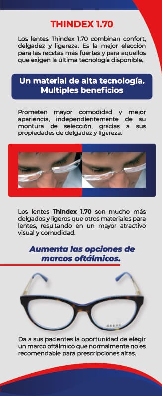 Los lentes Thindex 1.70 combinan confort, delgadez y ligereza. Es la mejor elección para las recetas más fuertes y para aquellos que exigen el ultimo material y tecnología disponible.